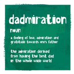 Front of card: Dark green Illustration with abstract white text in the centre Non-editable text reads: "Dadmiration noun. A feeling of love, admiration and gratitude towards one's father. The admiration derived from having the best dad in the whole wide world."