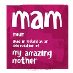 Front of card: Purple Illustration with abstract white text in the centre Non-editable text reads: "Mam. Noun. Used in Ireland as an abbreviation of my amazing mother."
