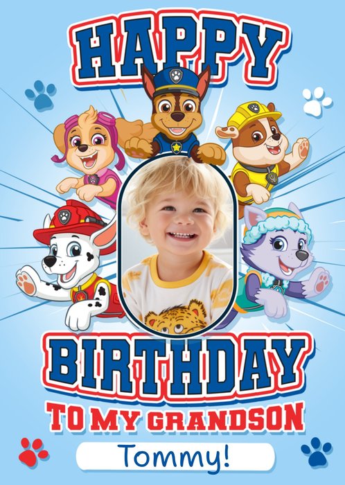 Front of card: Featuring Marshall, Rubble, Chase, Skye and Everest surrounding a photo frame on a blue background. Text reads: "Happy birthday to my grandson Tommy". 'Tommy' can be personalised!