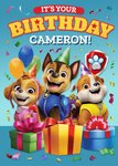 Featuring PAW Patrol's Skye, Chase, and Rubble wearing party hats with balloons, wrapped presents, and confetti on a blue background, this greeting card is perfect for a child's birthday.