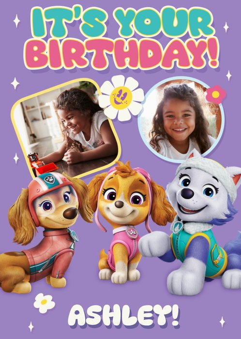 Featuring PAW Patrol puppies Everest, Skye & Sweetie on a purple greeting card, with a tilted, rounded rectangle photo area on the left, a circular photo area on the right, and small flowers and sparkles.