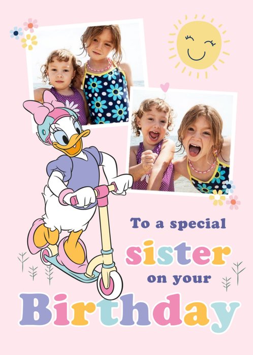 Front of card: Peppa Pig And Friends Photo Upload Birthday Card Illustration of Peppa Pig and friends with two photo frames. Text reads: Yay! It's your Birthday!".