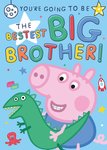 Celebrate a child's exciting new role as a big brother with this cheerful Peppa Pig card. Featuring George holding his favourite dinosaur toy, colourful lettering, and fun space-themed decorations, this card is perfect for making a little one feel special.