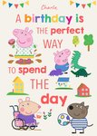 Front of card: Peppa Pig Birthday Card Illustration of Peppa Pig and friends having fun. Text reads: "Charlie, a birthday is the perfect way to spend the day". 'Charlie' can be personalised!