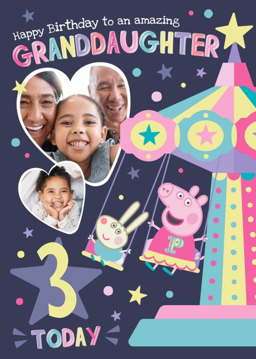 A cheerful funfair themed Peppa Pig birthday card for a special granddaughter turning 3. The design features Peppa on a fairground carousel with Rebecca Rabbit, surrounded by stars, dots, and heart-shaped photo frames for your images.