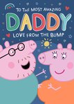 A sweet and colourful Peppa Pig Father's Day card designed for a daddy-to-be. Featuring Mummy Pig and Daddy Pig joyfully cradling a baby bump, the design includes a heart-shaped photo upload frame at the top, surrounded by rainbows, stars, hearts, and a baby bottle on a soft cream background. A lovely message from mummy and bump.