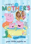 A fun and adorable Mother’s Day card featuring Peppa Pig, George Pig, and Mummy Pig enjoying a bubbly bath. The background has a playful blue-striped design with floating bubbles, rubber duckies, and bath toys. A heart-shaped photo frame includes smiling children wrapped in cosy bathrobes, making it the perfect card for a loving mum from her little ones.