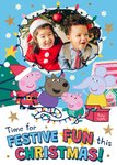 This Peppa Pig Christmas card design features Peppa and her friends dressed in festive outfits, decorating a Christmas tree with fairy lights and surrounded by cheerful holiday elements like stars, a gingerbread house, and colourful text below. There is a photo upload area surrounded by fairy lights.