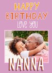 Front of card: 'Love you Nanna' Photo Upload Birthday Card Photo frame on a pink background with fun and vibrant text. Text reads: "Happy birthday love you Nanna".