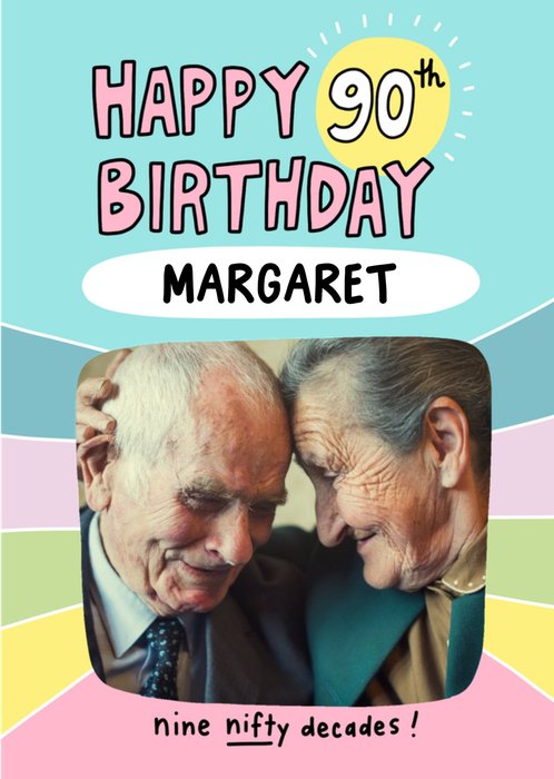 Front of card: Nan's 90th Photo Upload Birthday Card Photo frame surrounded by flowers on a pink background. Text reads: "Happy birthday Nan 90 love always Rachel". 'Rachel' can be personalised!