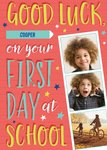 Front of card: First Day At School Photo Upload Card Photo strip with colourful text surrounded by stars. Text reads: "Good luck Cooper on your first day at school". 'Cooper' can be personalised!