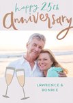 Front of card: Large photo upload area in central third of card. Handwritten anniversary message above in aqua and gold coloured type. 2 illustrative champagne flutes and aqua editable names below all on a pale stone coloured stripy background. Text reads:"Happy 25th Anniversary Lawrence & Bonnie" With customisable names.