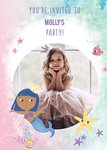 Front of card: Large circular photo upload area surrounded by a cute illustration of an underwater scene. Message at the top with editable name. Text reads:"You’re invited to Molly’s party!". With customisable name.
