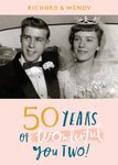 Front of card: Large photo upload area in the centre of the card. Editable name spaces above with anniversary message below, all on a light pink background. Text reads:"Richard & Wendy. 50 years of wonderful you two!" With customisable names.