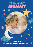 Front of card: Circular photo upload space in centre of card surrounded by illustrated moon, stars and clouds on a blue background. With editable text and Mummy at top and message underneath. Text reads: "To my lovely Mummy love you to the stars and back" With customisable To My Lovely.