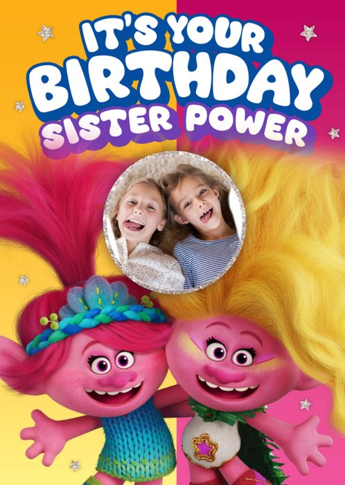 Circle shaped photo upload space with cute illustrated scene which includes 2 Princesses, a horse, some clouds and a rainbow. All on a light coloured background with editable typographic text.