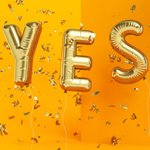 Photographic gold balloon letters on an orange background spelling out the word YES, with gold confetti showering down. Exam congratulations card.