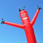 Photographic happy smiling inflatable character blowing in the wind on a blue sky background. No caption, congratulations card.