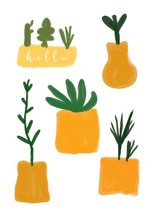 Picket + Vine Happy Birthday Card Front of card: Five simple Illustrations of cactii. the above left illustration has the words "Hello" written underneath. On a white background.