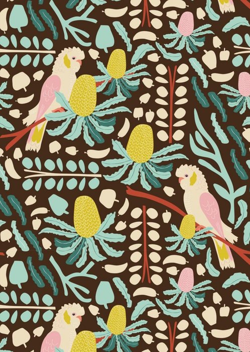 Repeating pattern of parrots surrounded by leaves and floweres. Design uses pastel colours including greens, oranges and pinks. On a dark brown background.
