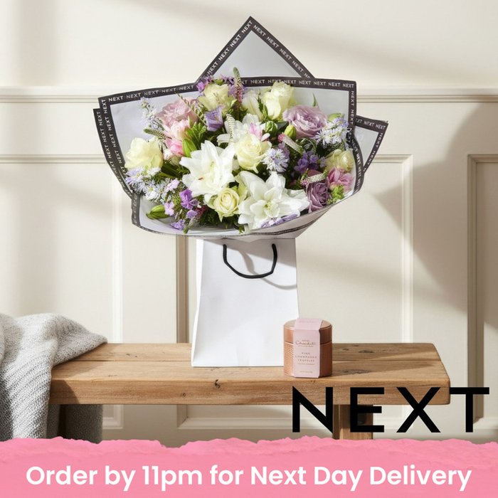 NEXT Pink & Lilac Lily Bouquet with Hotel Chocolat Champagne Truffles Gift Set