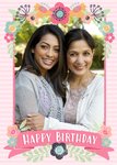 Pink Stripes And Flowers Happy Birthday Photo Card