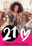 The card reads: "21, happy birthday mommy!". Happy birthday mommy is editable.