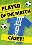Player Of The Match Personalised Blue Football Kit Birthday Card, the football kit can be customised with a name and number. Send a personalised card to the football fan in your life. - Football Birthday Card