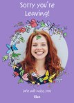 Poet and Painter - Photo upload sitting in a garland frame, that features illustrations of butterflies, stars and flowers. The card background colour is purple. The caption reads non editable Sorry You're Leaving. We Will Miss You. Followed by the editable recipients name.