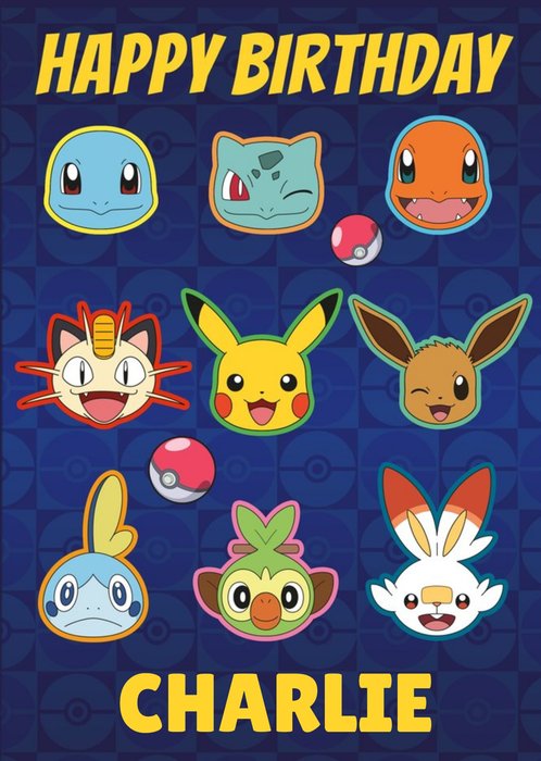 Pokemon character heads on blue pokeball background. Personalised name. Text reads: "Happy Birthday Charlie"