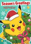 Pokemon Pikachu wearing a Santa hat and jumping through a wreath. Personalised recipient / name card. Text reads: "Season's Greetings Nephew!"