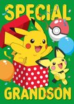 This playful greeting card features Pikachu popping out of a red polka dot gift box, accompanied by Pichu and colourful balloons, all set against a bright green background, surrounded by confetti.