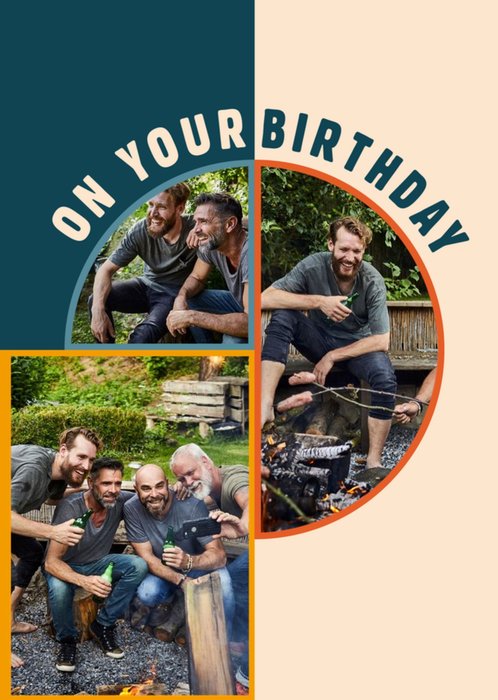 Poster Prints retro Bauhaus inspired design. The card has three photo upload options and a non editable caption that reads Happy Birthday. The card background colour is split into two panels of dark teal and cream.