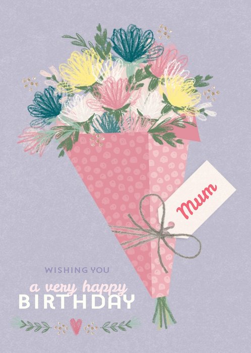 A sweet and sentimental Birthday card for a mother featuring hand-painted style illustrated bouquet of flowers on a purple background.