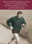 "After a month of jogging ten miles a day, he was feeling terrific, the only problem was he was 300 miles from home!"