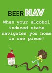 Front of card: Typographic card with of a illustration house and a person The text reads: "BeerNAV when your alcohol enduced state navigates you home in one piece!