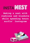 Front of card: Typographic card with of a illustration of someone on their sofa with blankets and a laptop The text reads: "InstaNest making a nest with cushions and blankets while spending hours surfin' Instagram"