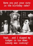 Front of card: An image of two dogs, with text The text reads: "Have you put your nuts in the birthday cake? Yeah... and I dipped my todger in too when nobody was looking!"
