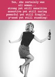 "Yes, she certainly was all woman... strong yet still sensitive assertive yet still caring powerful yet still fragile... p*ssed yet still standing!"