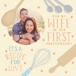 Front of card: Recipe For Love! Anniversary Photo Upload Card Illustration of baking utensils. Text reads: "For my wife on our first anniversary, It is a recipe for love"