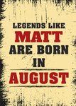 Front of card: August Birthday Card Red and black typography on a grunge background. Text reads: "Legends like Matt are born in august". 'Matt' can be personalised!