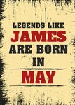 Front of card: May Birthday Card Red and black typography on a grunge background. Text reads: "Legends like James are born in may". 'James' can be personalised!