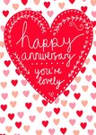 Front of card: Illustrated big heart in centre on card with cursive text, on a white heart patterned background. Text reads: "happy anniversary you're lovely"