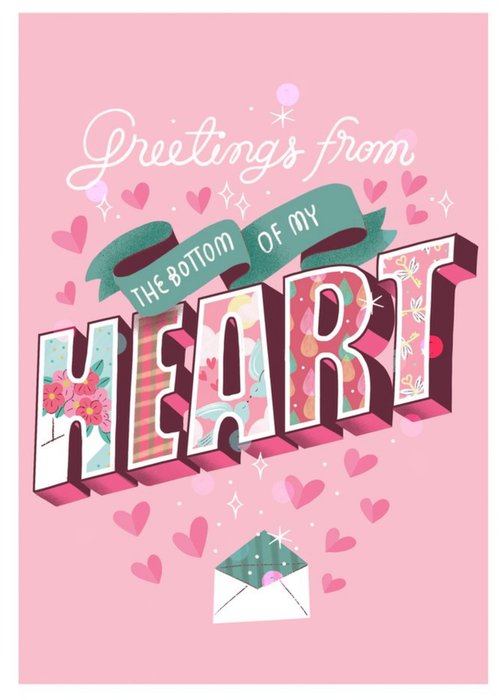 Front of card: Valentine's Day Card Retro 3D typography surrounded by hearts on a pink background. Text reads: "Greetings from the bottom of my heart".