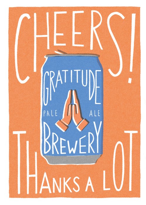 Featuring an illustration of a blue beer can labelled "Gratitude Brewery" centred on a textured orange background with large hand-lettered typography above and below.