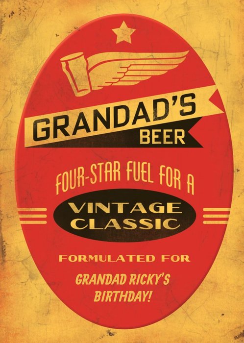 Front of card: Retro Grandad's Beer Birthday Card Retro typographical personalised card. Text reads: "Grandad's Beer Four Star Fuel For A Vintage Classic"