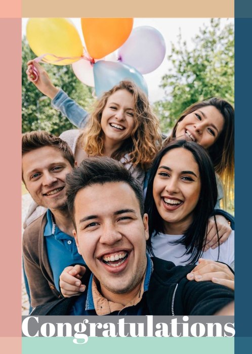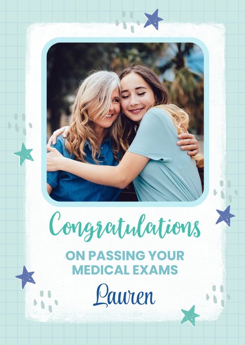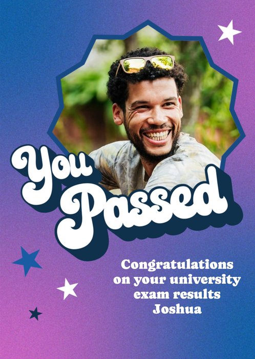 Front of card: You Passed! Photo Upload Congratulations Card Retro typography with a starburst photo frame and stars on a blue and purple background. Text reads: "You passed" and "congratulations on your university exam results Josua". 'Congratulations on your university exam results Josua' can be personalised!