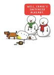 Featuring a funny illustration of 3 snowmen, one is lying on the floor with dog poo on his face. The dog is also weeing on the snowman, making his snow yellow.
