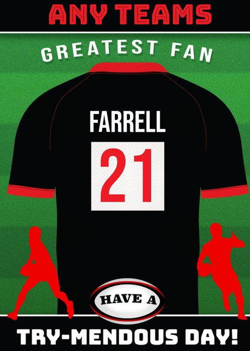 "Any team's greatest fan Farrell 21 have a try-mendous day!". 'Any team's' must be personalised, 'Farrell 21' can be personalised!