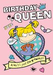 Front of card: Rugrats Birthday Queen Card Angelica Character Birthday Queen On Pink Background Standing In Heart Frame. Text reads: "Arent I just The Greatest"